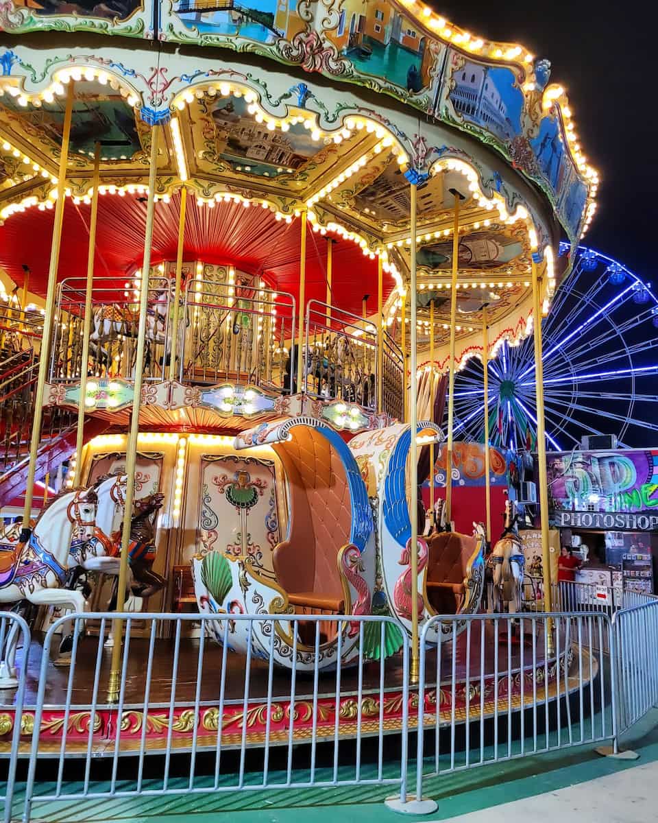 Evening Excitement: The park transforms after sunset with dazzling lights and a vibrant atmosphere, featuring carnival games, food stalls, and family-friendly entertainment shows. The Ferris wheel provides breathtaking views of the illuminated coastline.