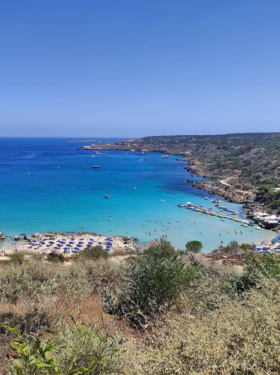 Hidden Gem: Nestled between Cape Greco and Protaras, Konnos Bay is a sheltered cove with golden sand and emerald waters. The surrounding pine-clad cliffs provide natural protection from winds, creating perfect swimming conditions.