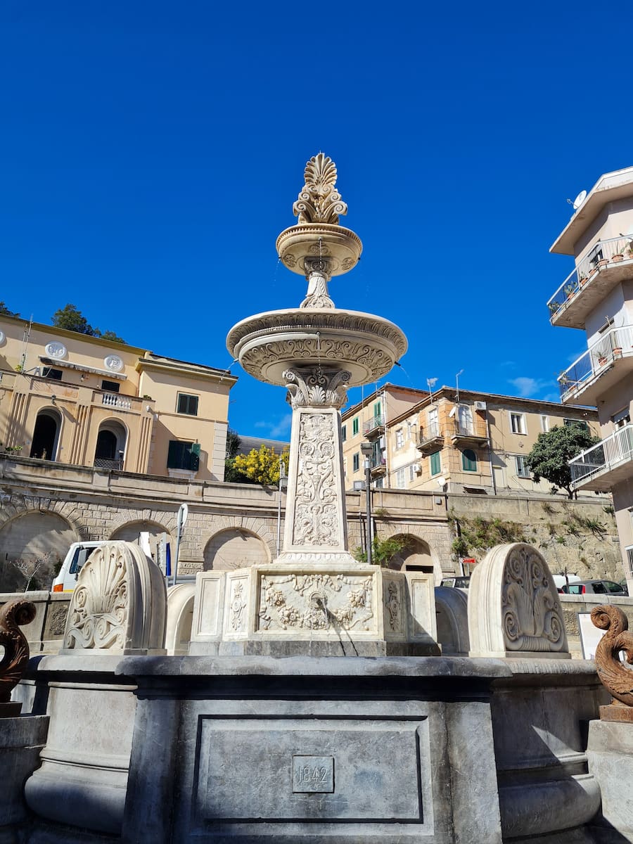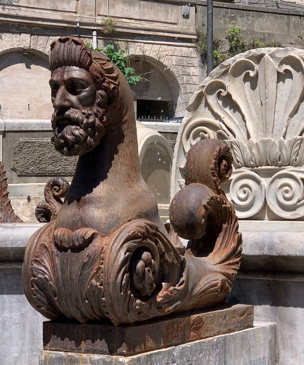 Neoclassical Beauty: The Fontana Falconieri, located in Piazza Basicò, was designed by Carlo Falconieri in 1842. This neoclassical fountain features intricate carvings inspired by marine life, including mythological creatures like griffins and dolphins. It was originally placed in Piazza Ottagona but was moved to its current location after surviving the 1908 earthquake.