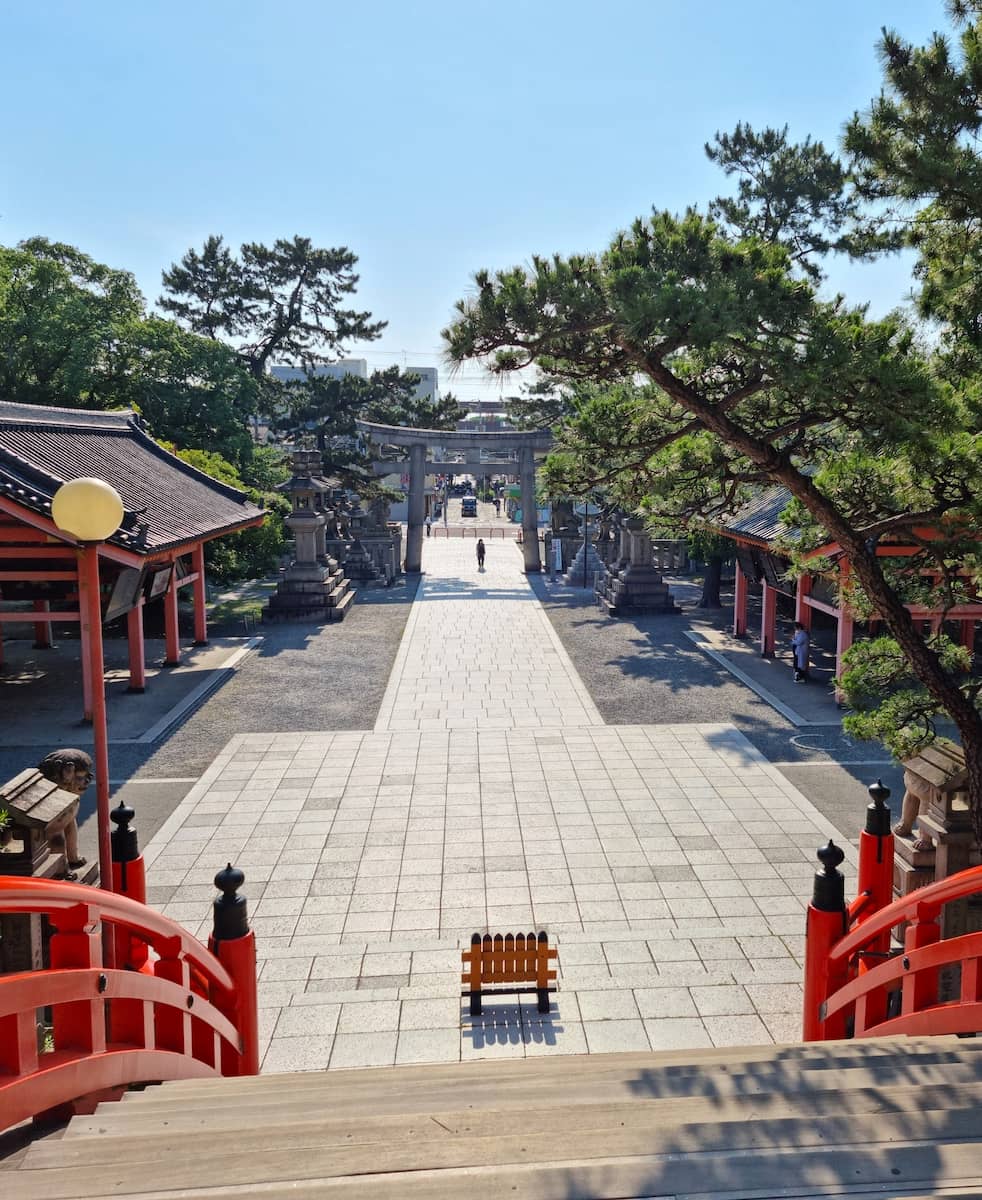 Sumiyoshi Taisha is one of Japan’s oldest Shinto shrines, offering a peaceful retreat from the bustling city. As I approached the shrine, I was immediately struck by its unique architecture, quite different from the shrines I’d seen in other parts of Japan. The most distinctive feature is the famous arched bridge, known as Sorihashi, which is said to represent the bridge between the human and spirit worlds.