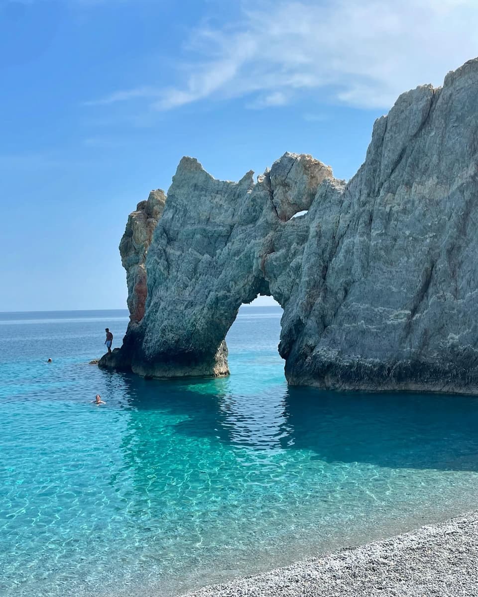 Skiathos is known for some of the best sandy beaches in Greece, with Koukounaries Beach being a top favorite. Located on the west end of the island, it’s surrounded by lush pine forests and offers crystal-clear waters. For a more dramatic experience, a visit to Lalaria Beach is a must, with its stunning rock formations and turquoise waters. You’ll also find Banana Beach, perfect for water sports enthusiasts.