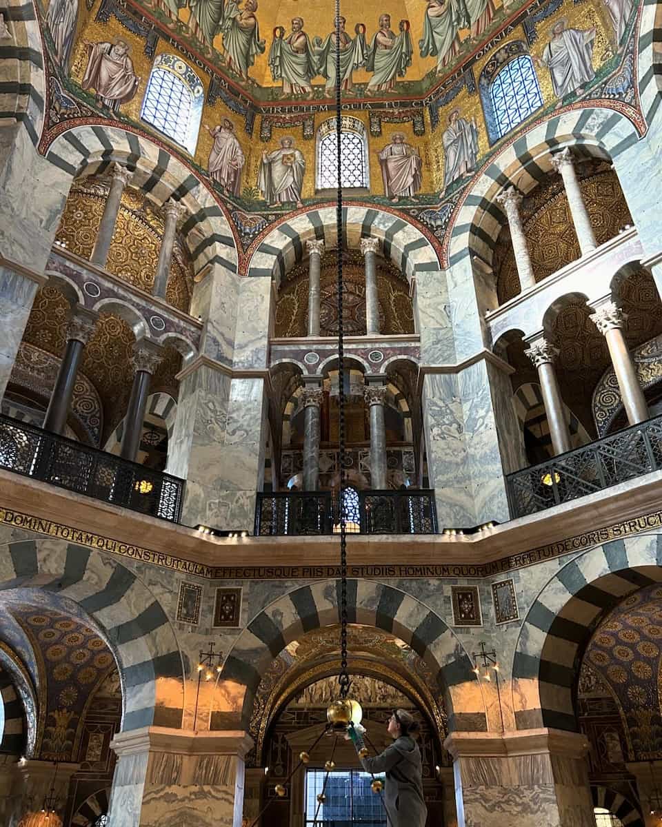 Must-See Features. The Palatine Chapel took my breath away with its soaring marble columns and glittering gold mosaics. The highlight is Charlemagne’s throne, perched atop six ancient stone steps – though you’ll need to join a guided tour to access this area.