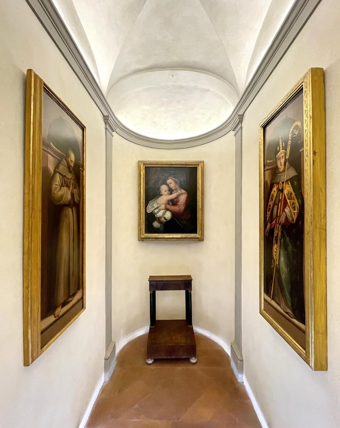 Artistic elements. Inside the refectory, I discovered a beautiful wooden Deposition by Giovanni da Rovezzano (1632), while the Chapel of San Felice da Cantalice houses a painting by Simone Pignoni showing the Madonna offering the Child to San Felice.