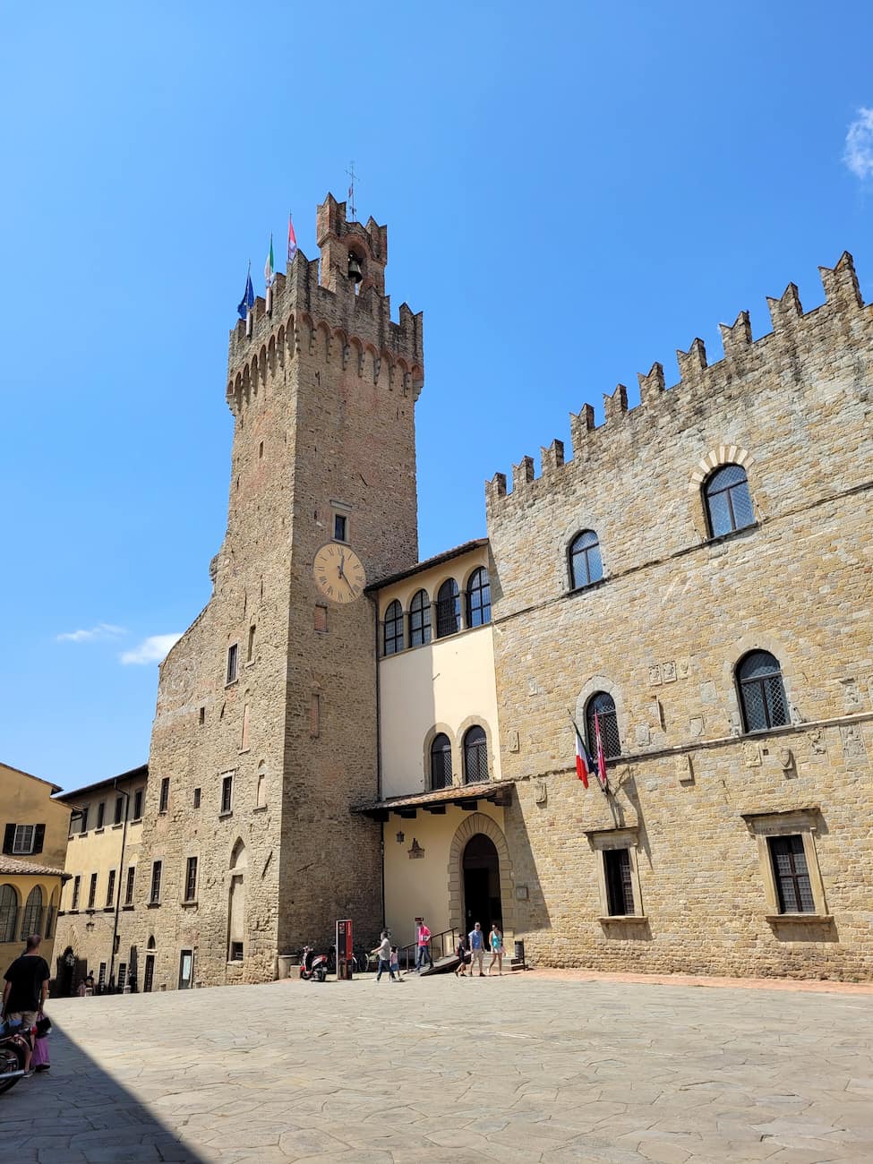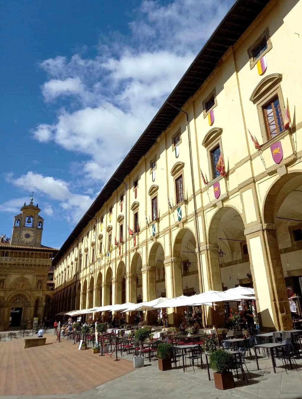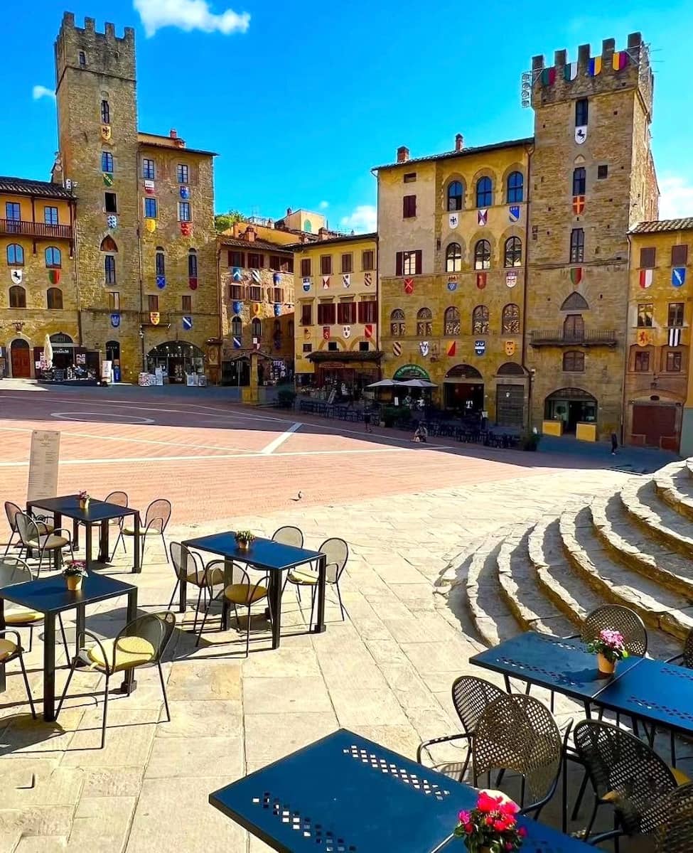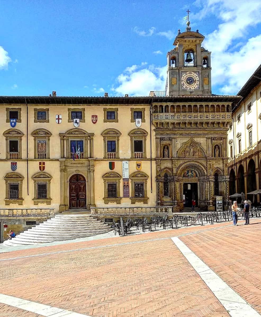 Surrounding treasures. The square is bordered by impressive structures including the elegant Logge del Vasari (designed by Renaissance master Giorgio Vasari) on the north side, the apse of Santa Maria della Pieve with its decorative arches, and the beautiful Palazzo della Fraternita dei Laici with its striking clock tower. Medieval stone buildings line the eastern edge, including the 13th-century crenelated Torre Faggiolana and the Cofani-Brizzolari palace.