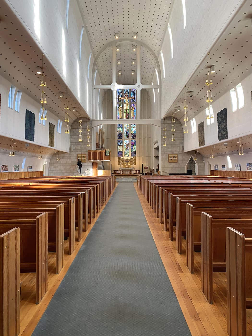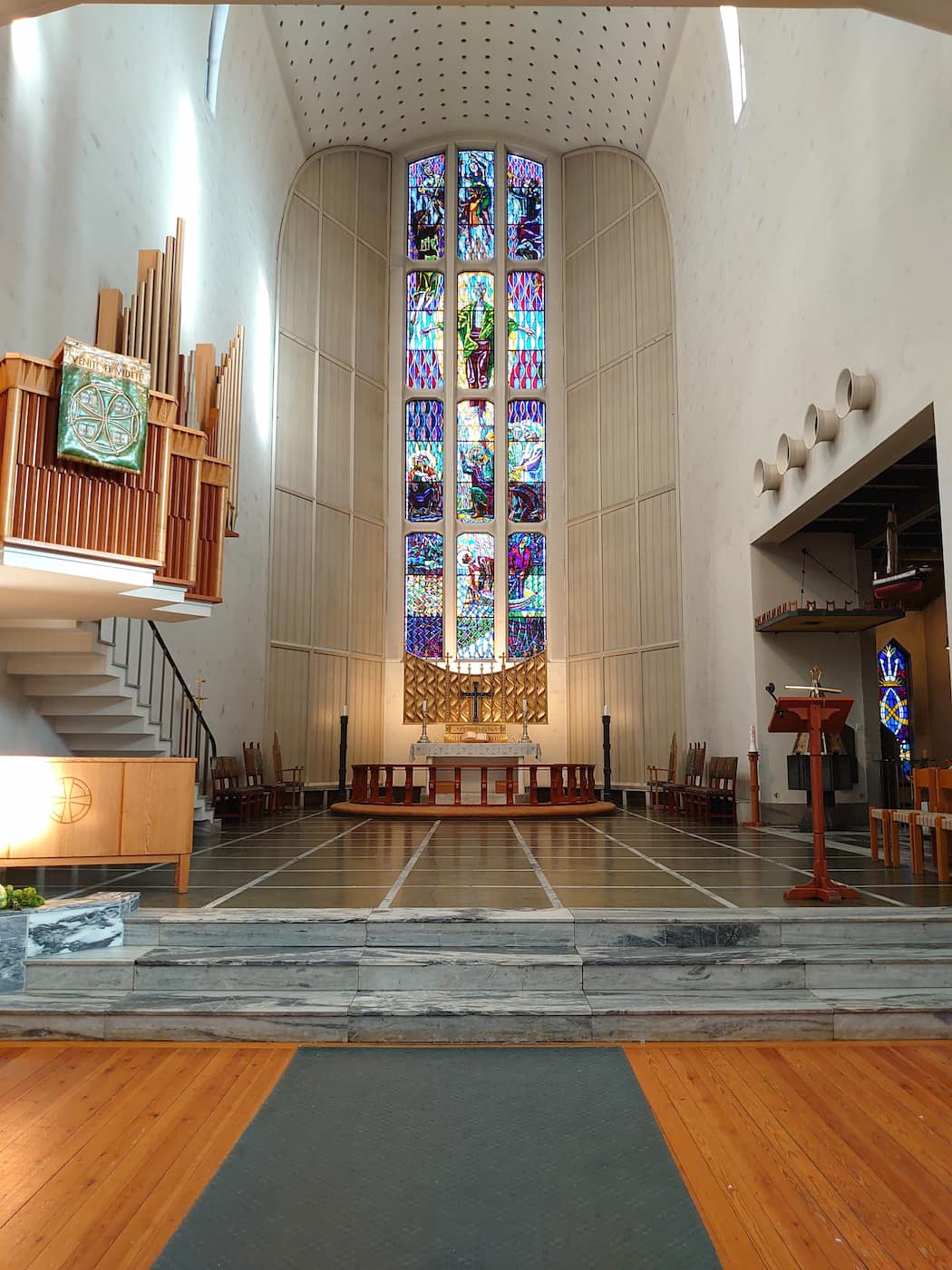 Interior treasures. Stepping inside, I was immediately drawn to the breathtaking 12-meter high stained glass window designed by Åge Storstein that dominates the east wall behind the altar. The cathedral’s spacious interior seats around 890 people, but even with other visitors, I found plenty of quiet corners to appreciate the artistry. The ten tapestries from Nordland region add warmth to the concrete walls, while the rose window creates a kaleidoscope of colors across the floor on sunny days.