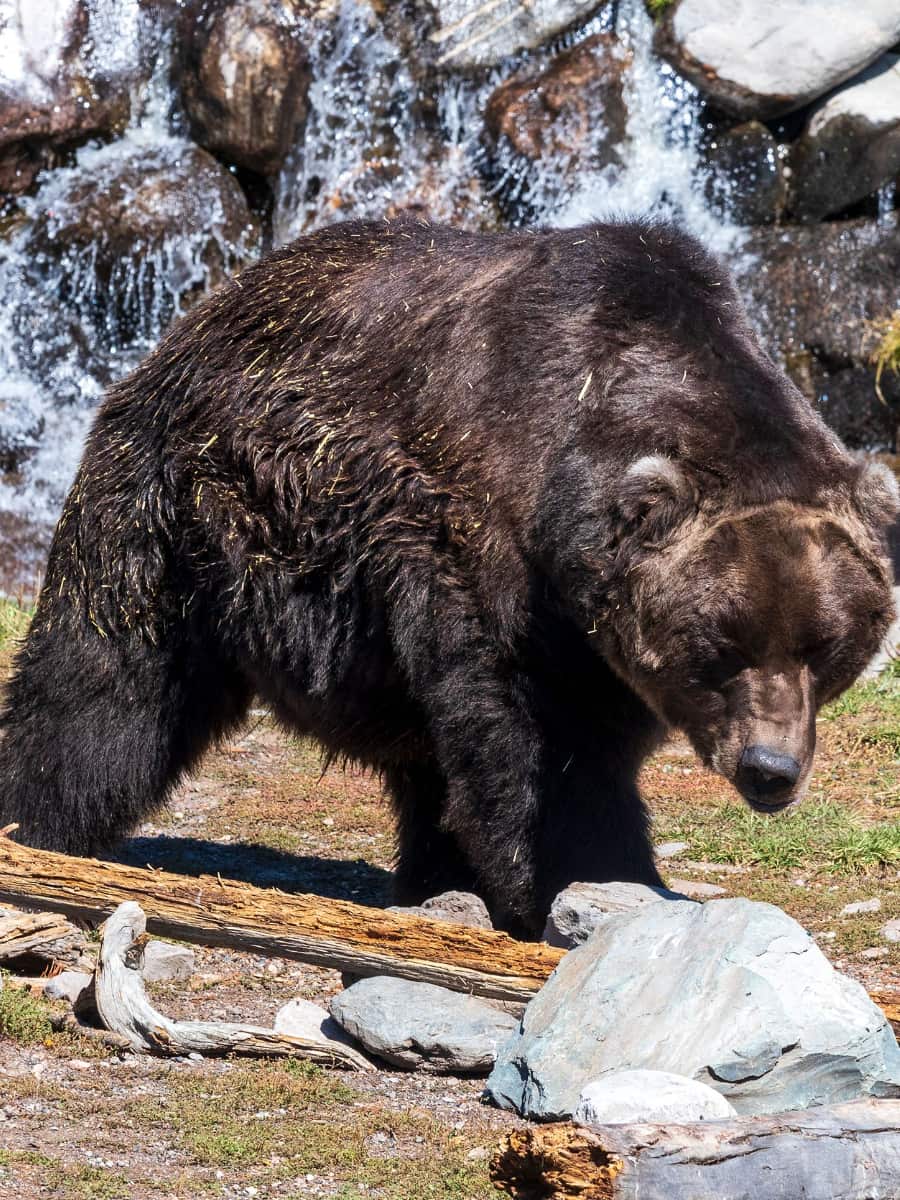 Watching the Bears. One of the most striking moments for me was watching a massive Alaskan grizzly toss logs and splash in the pond, just being a bear. The viewing area is separated by a deep moat, so you can safely stand just meters away and observe their natural behaviors — playing, foraging, or just lounging in the sun. Only one bear is out at a time, since grizzlies are solitary by nature. If you’re keen to see more, your ticket is valid for two days, so you can return and catch a different bear in action.