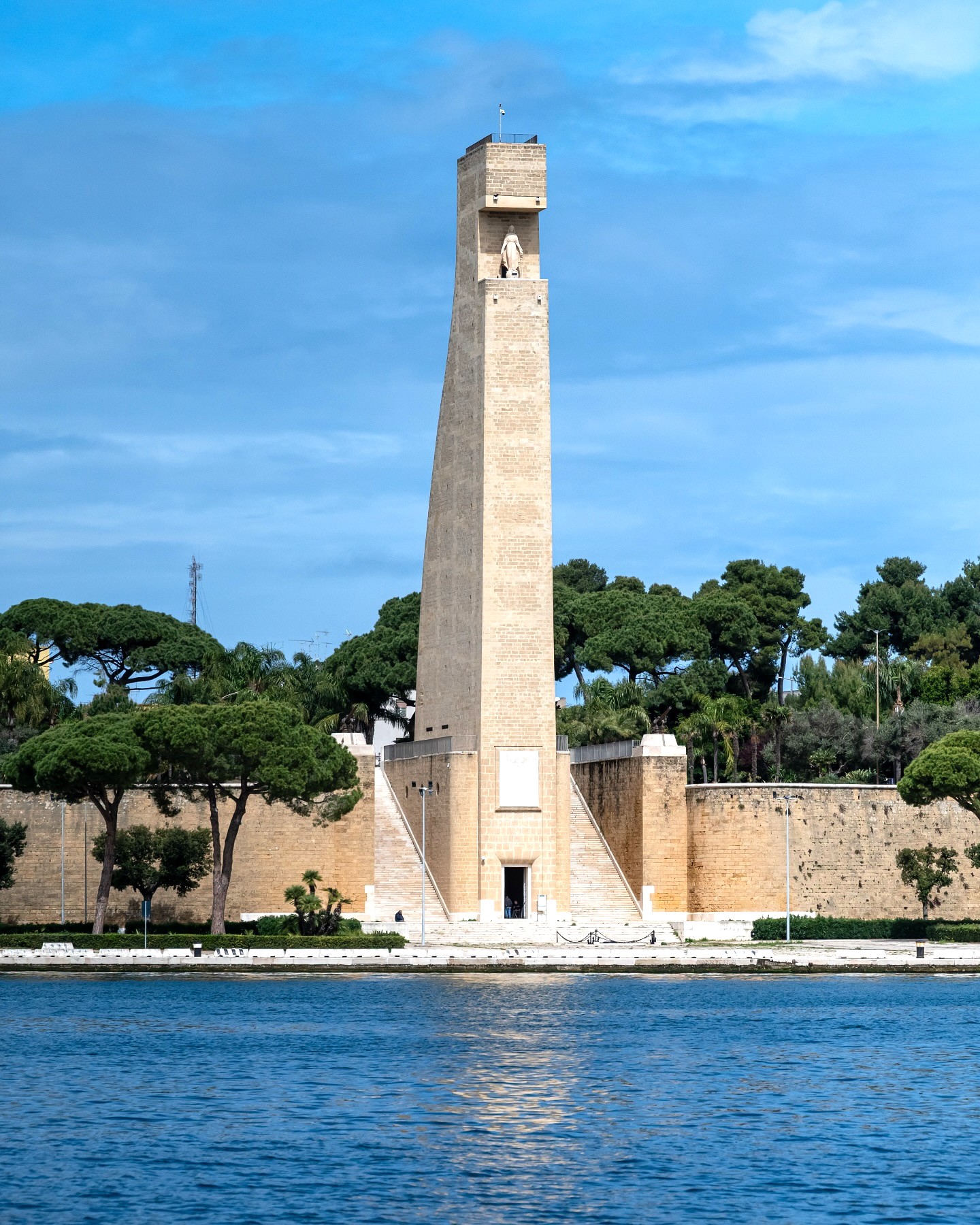 Maritime tribute. Standing 53 meters tall, the Monument to Italian Sailors (Monumento al Marinaio d’Italia) dominates Brindisi’s skyline. Shaped like a massive ship’s rudder, this impressive structure honors sailors who lost their lives at sea.