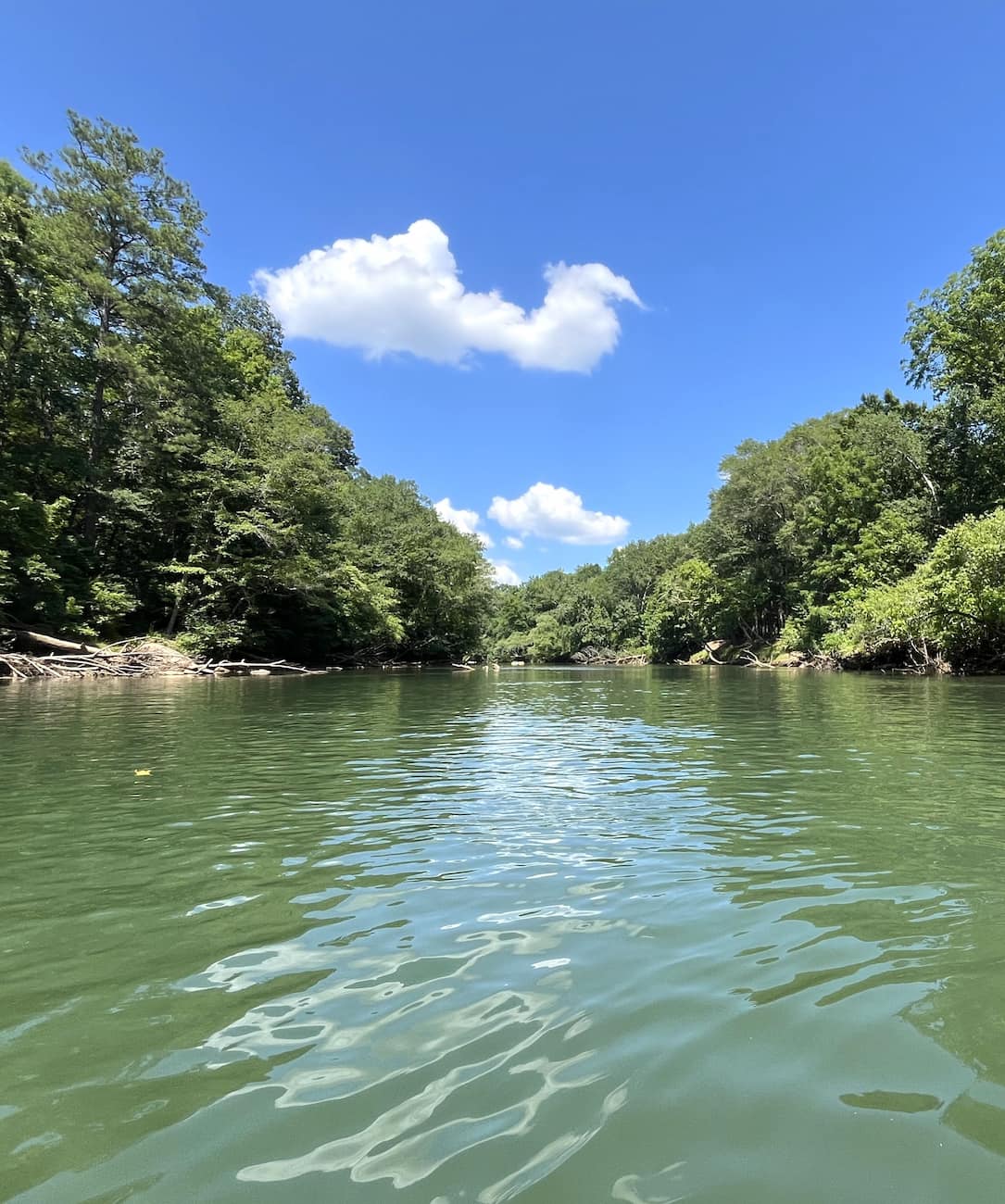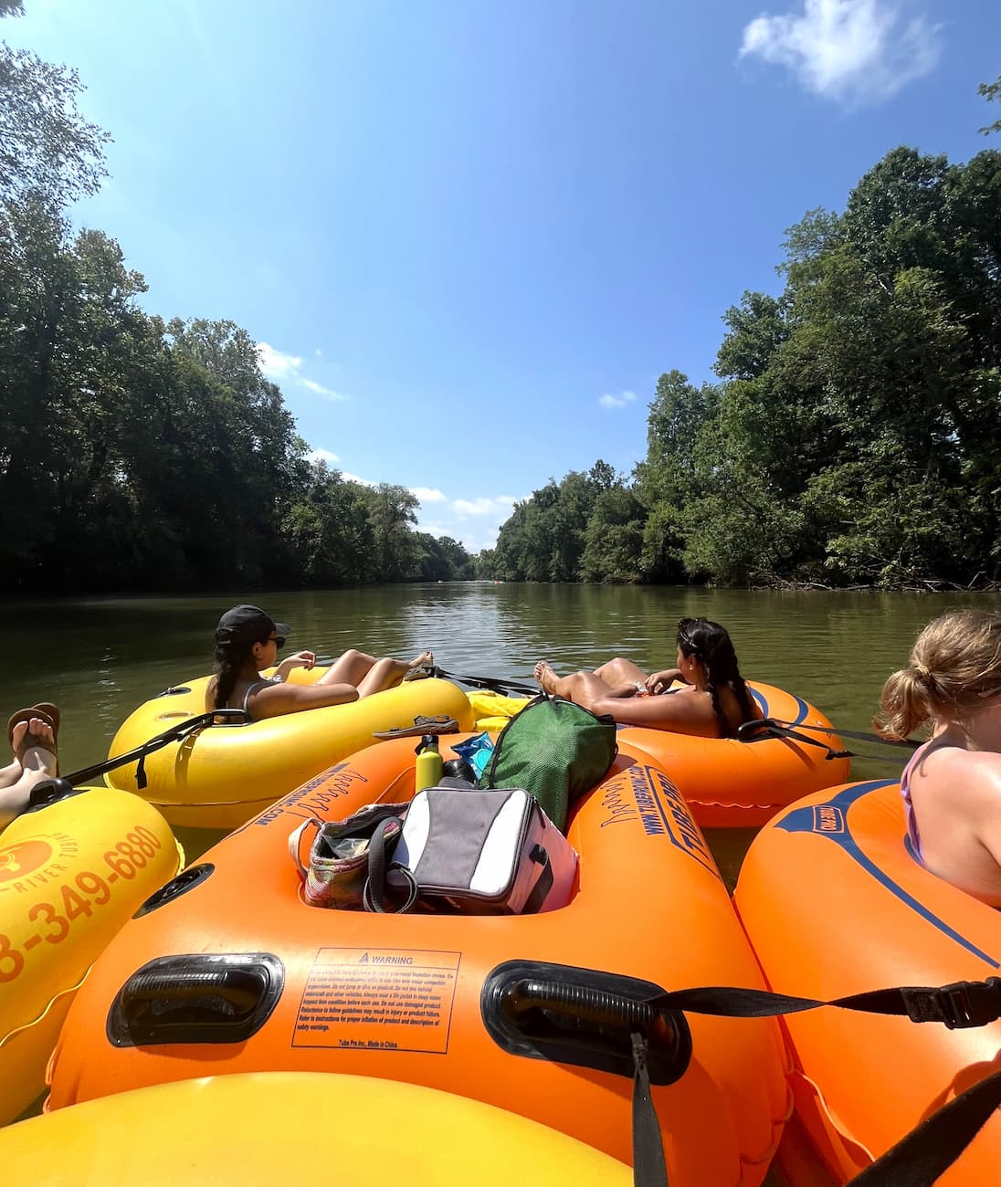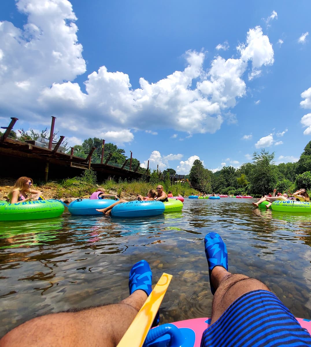 Tips for the Best Experience. I learned quickly that water shoes and a long stick for pushing off rocks are a must—both are sold at the outposts if you forget. Bring a waterproof bag for your phone and snacks. If you’re tubing with friends or family, you can tether your tubes together for a group float. Some people even bring a cooler tube for drinks and snacks, making it a floating picnic. Dogs are welcome at Cool River Tubing, and they can ride in your lap or get their own tube.