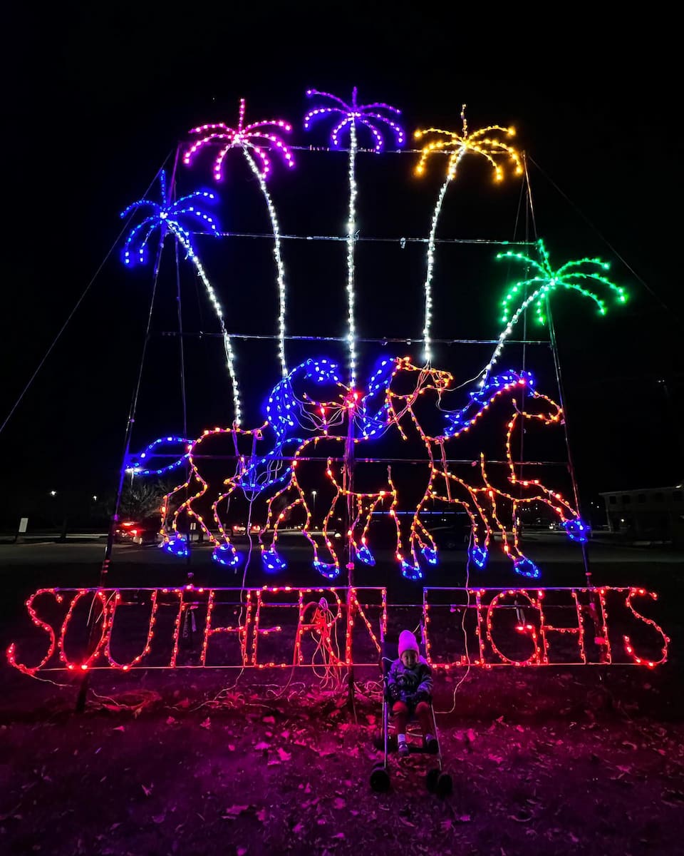 Activities Beyond the Lights. At the end of the driving route, visitors can park and explore even more fun. Animal Land, included with admission, lets you meet exotic animals and farm favorites. Kids can ride a camel or pony for $6 each. The Holiday Village features photos with Santa, model trains, and a merchandise tent with event keepsakes. Food trucks and kettle corn are available near Animal Land, and public restrooms are located by the Campground Entrance and Animal Land. Special events like the Southern Lights Stroll and 5K let you walk or run through the lights before the event opens to cars.