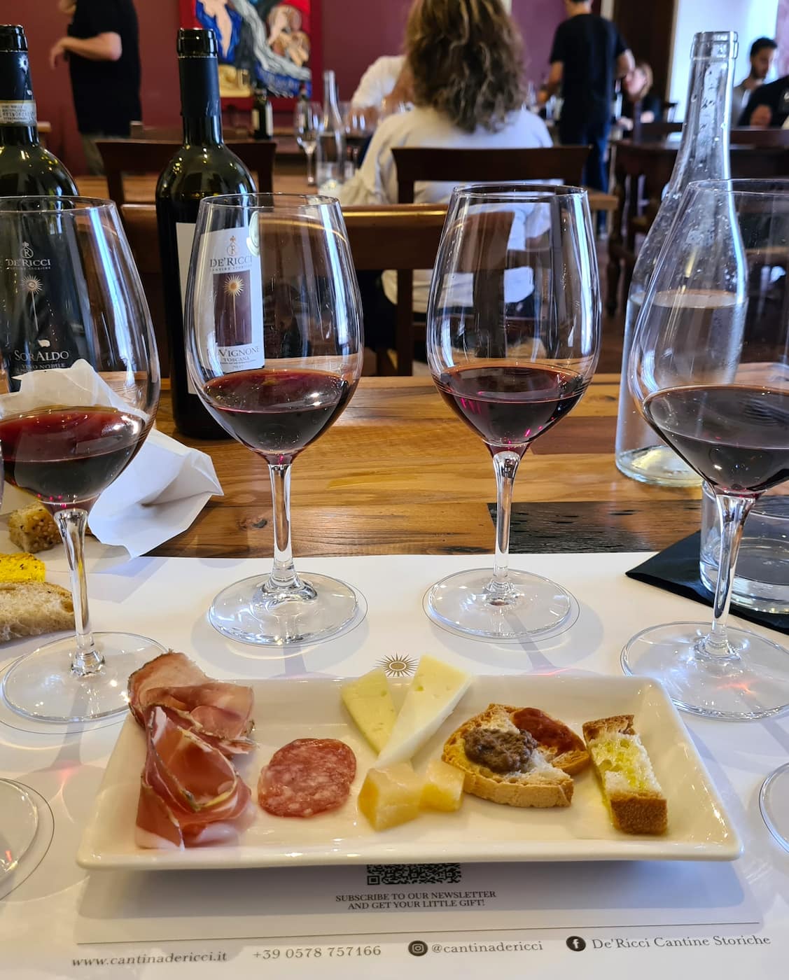 Tasting experience.Ā The tour culminated in a tasting room where I sampled six different wines, including their prized Vino Nobile di Montepulciano. Each glass was paired with local products from Val d’Orcia and Val di Chiana – pecorino cheese, salumi, and bruschetta drizzled with their own olive oil.