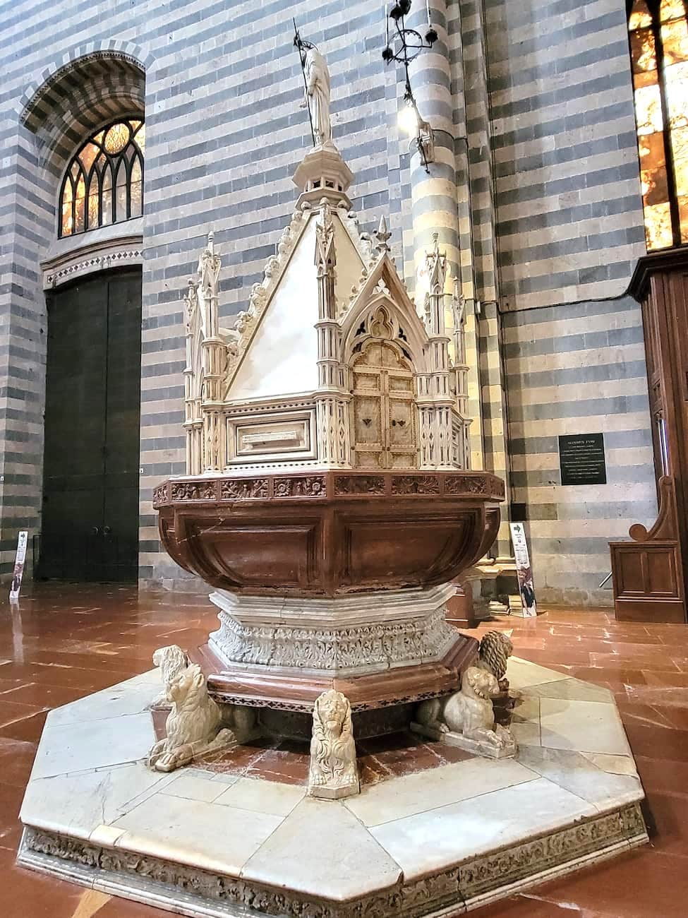 Interior treasures. Inside, I discovered several noteworthy artworks, including a 14th-century wooden crucifix and frescoes by local artists. The baptismal font dates from 1516 and shows exquisite Renaissance craftsmanship in its marble reliefs.
