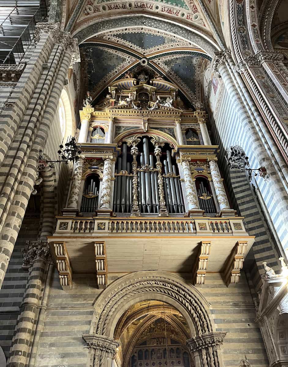 Interior treasures. Inside, the duotone marble creates a striking visual effect that emphasizes the tall pillars and spacious naves. The cathedral houses priceless artworks, including Luca Signorelli’s breathtaking frescoes in the Chapel of San Brizio. These vivid paintings depicting the Last Judgment are considered his greatest work.