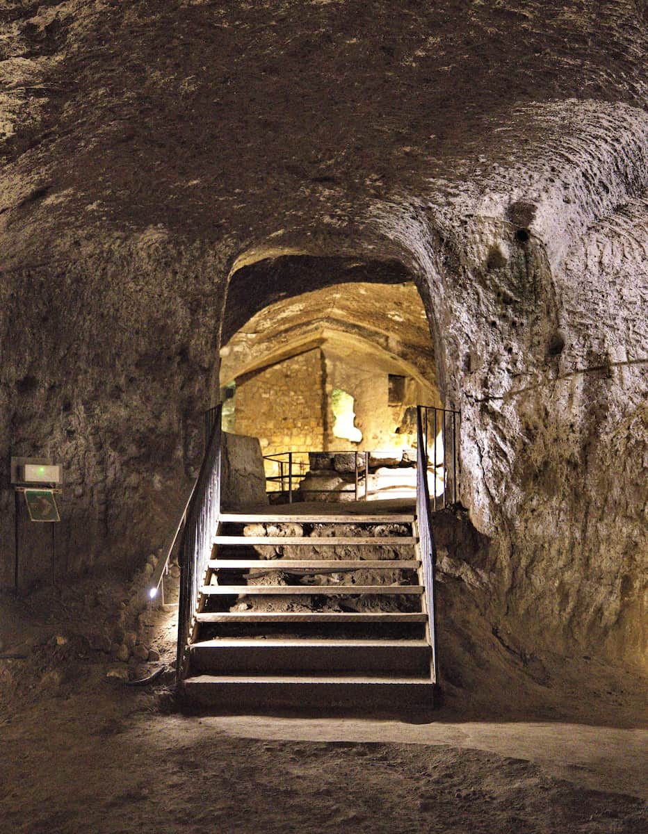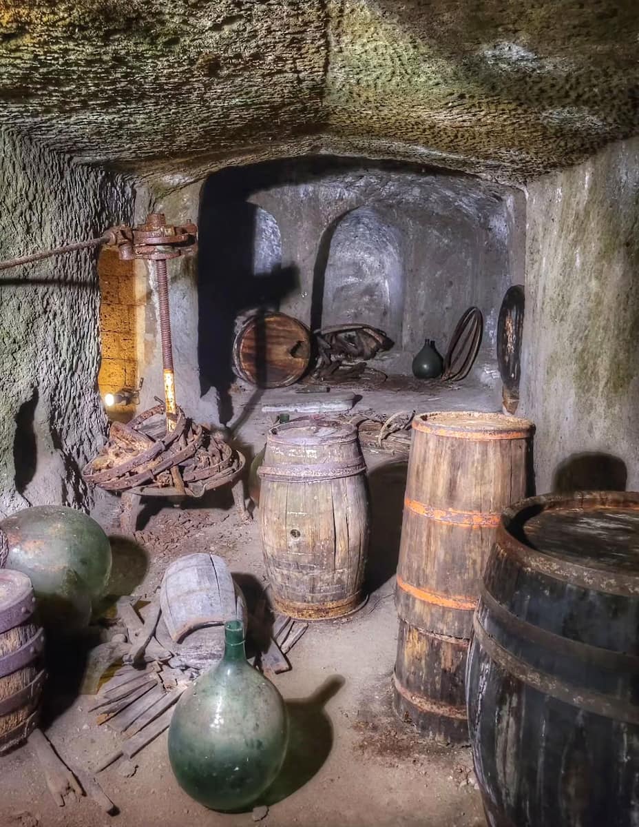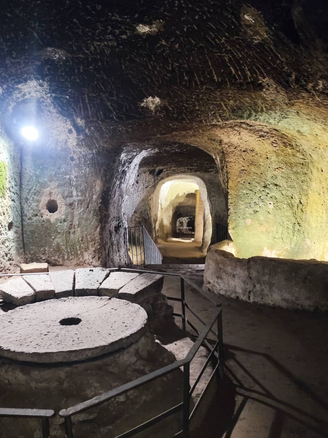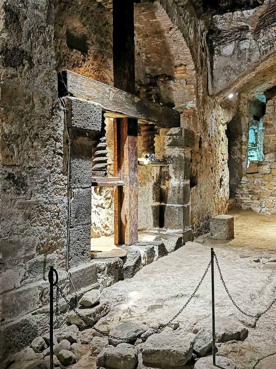 Medieval expansion. The underground network continued to grow throughout the Middle Ages. During my tour, I saw a well-preserved olive oil mill from the 1300s, complete with grindstones (one dated 1697), presses, and storage areas. There’s even a fireplace and mangers for the animals that once powered the mill.