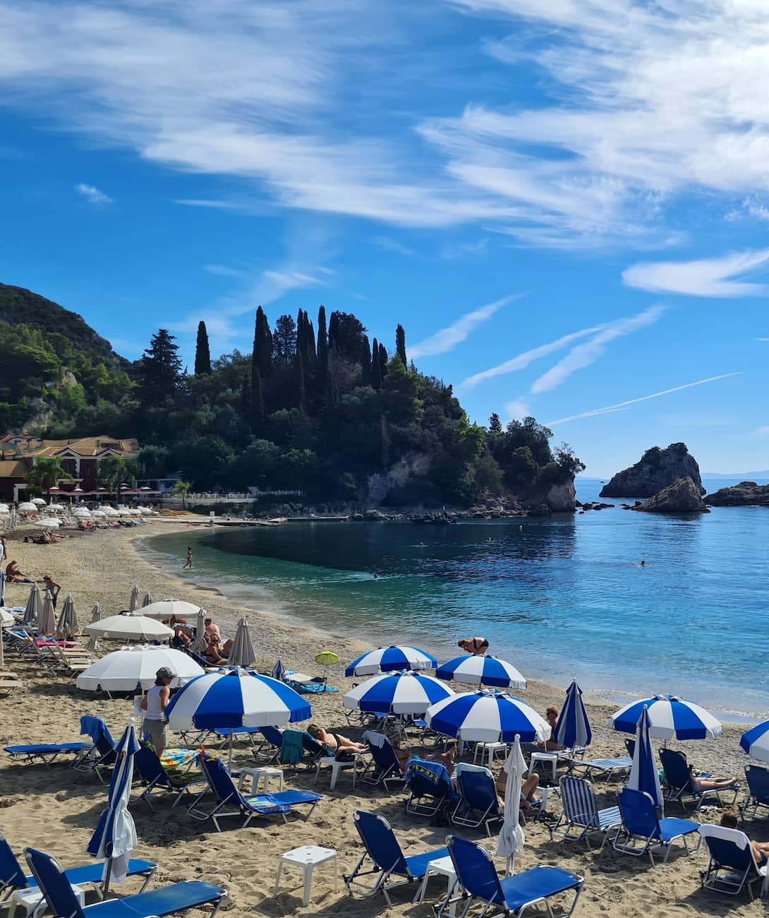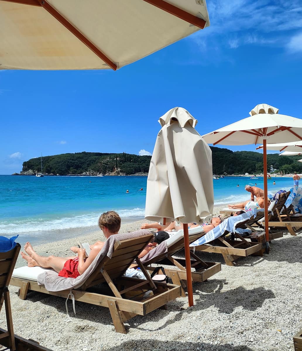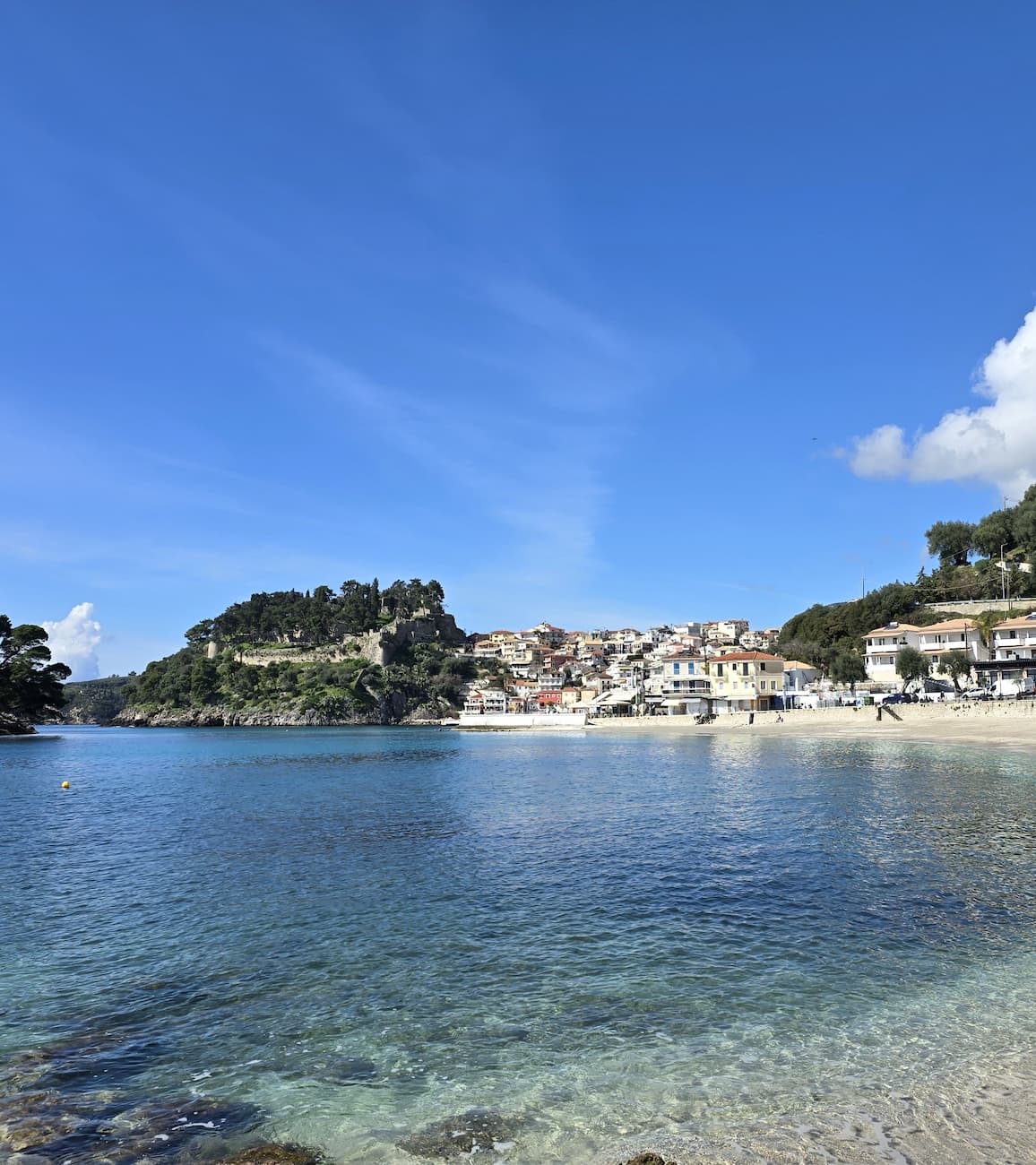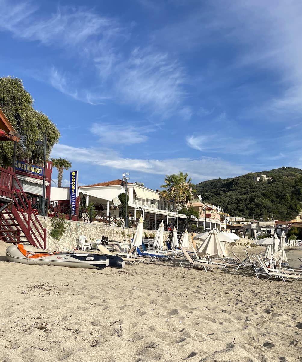 Central Oasis. Just steps from Parga’s bustling town center lies Krioneri Beach, a perfect example of why you don’t need to spend money to enjoy the best of Greek coastal life. During my week-long stay, this became my go-to morning spot – a place to enjoy my coffee while watching the town slowly come to life. What surprised me most was finding such a clean, well-maintained beach right in the heart of town. The crescent of golden sand curves gently around crystal-clear waters, with views of the islet of Panagia and its iconic white chapel just offshore.