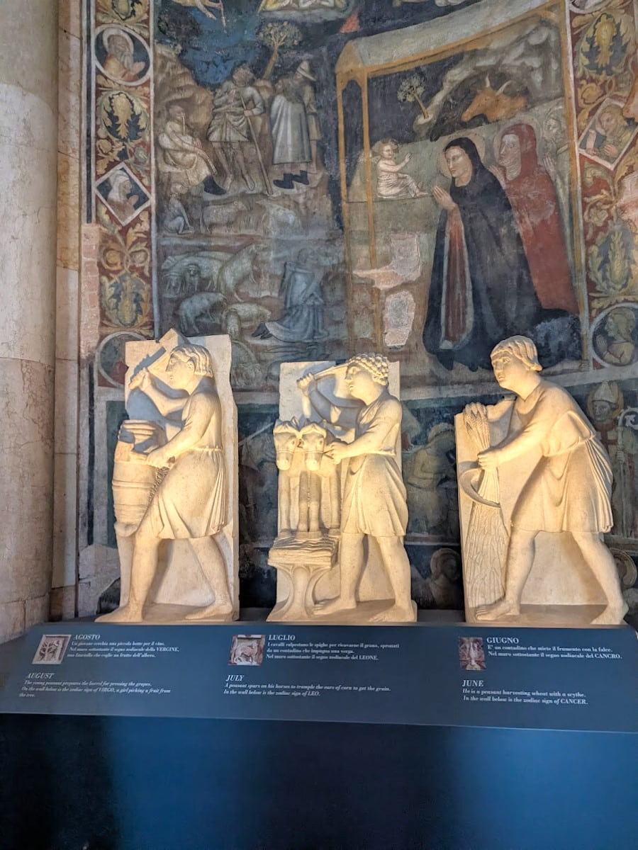 Interior Marvels. Stepping inside, I was enveloped by a sense of sacred history. The dome’s frescoes created a mesmerizing play of light, particularly striking at noon when sunbeams highlighted hidden details. I found myself lost in contemplation of the sixteen-sided polygonal space, admiring Benedetto Antelami’s sculptures representing the Months, Seasons, and Signs of the Zodiac.