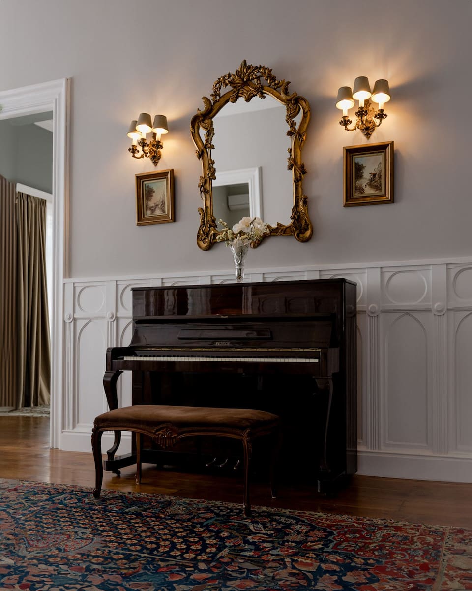 - Hand-painted wall murals by Italian artist Giuseppe Guidicini