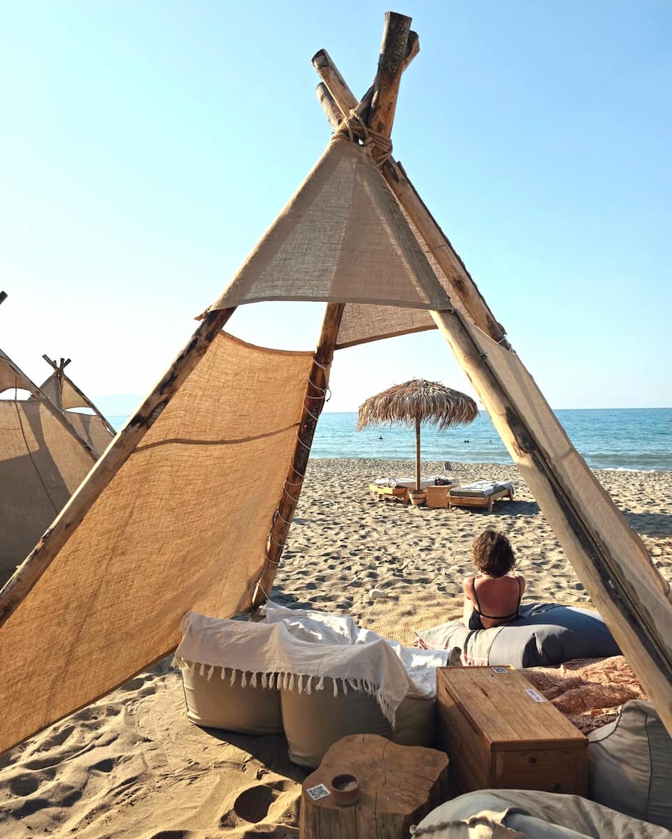- Facilities: Basic tavernas, restrooms, umbrella rentals (€7)