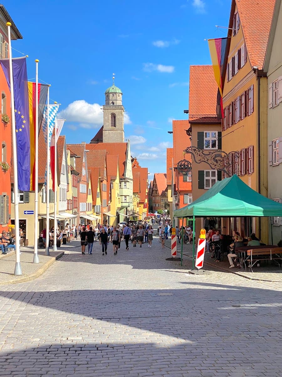 Dinkelsbühl Highlights. Just 30 miles (50km) from Rothenburg and only a 35-minute drive, Dinkelsbühl charmed me with its authentic medieval ambiance and noticeably fewer tourists. The town features completely intact medieval walls, the stunning St. George’s Minster, and colorful merchant houses along Weinmarkt. What makes Dinkelsbühl special is that it survived both the Thirty Years’ War and World War II virtually unscathed, meaning almost everything you see is original rather than reconstructed.