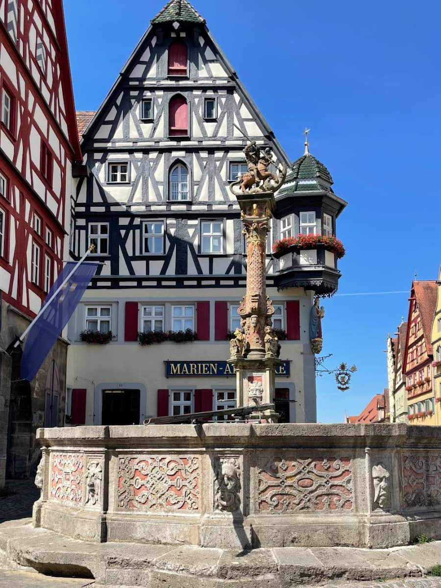 Architectural Gems. The impressive Town Hall dominates the square with its striking combination of Gothic and Renaissance styles. Built in stages between the 13th and 16th centuries, this magnificent structure showcases Rothenburg’s former wealth and importance. I was particularly struck by the contrast between the Gothic section’s soaring lines and the Renaissance building’s harmonious proportions.