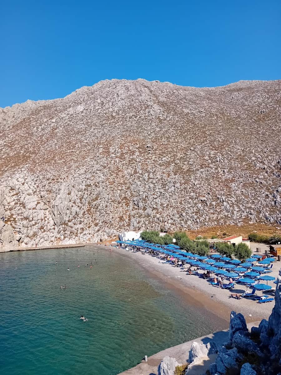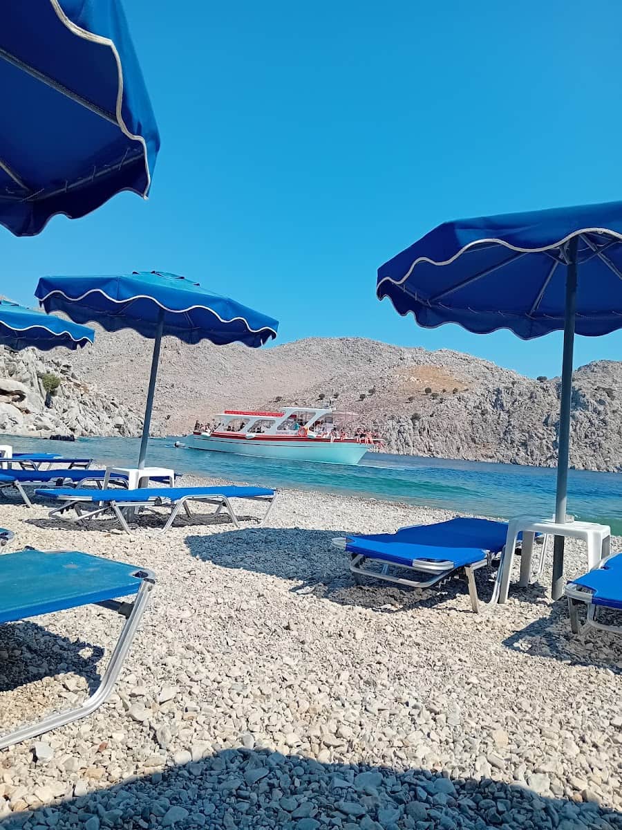 Nanou Beach is only accessible by taxi-boat from the port of Symi or by a long walk. The journey by boat takes about 30–45 minutes and brings you to a beautiful bay with blue waters and sunbeds.