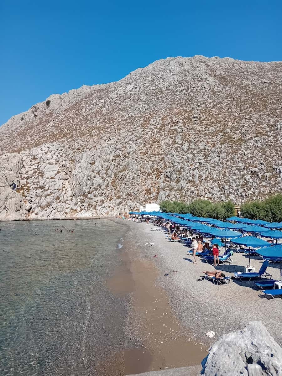 Beach Features. This organized pebble beach is famous for its crystal-clear turquoise water, perfect for swimming, snorkeling, and sunbathing. Sunbeds are available, often for free if you dine at the taverna.