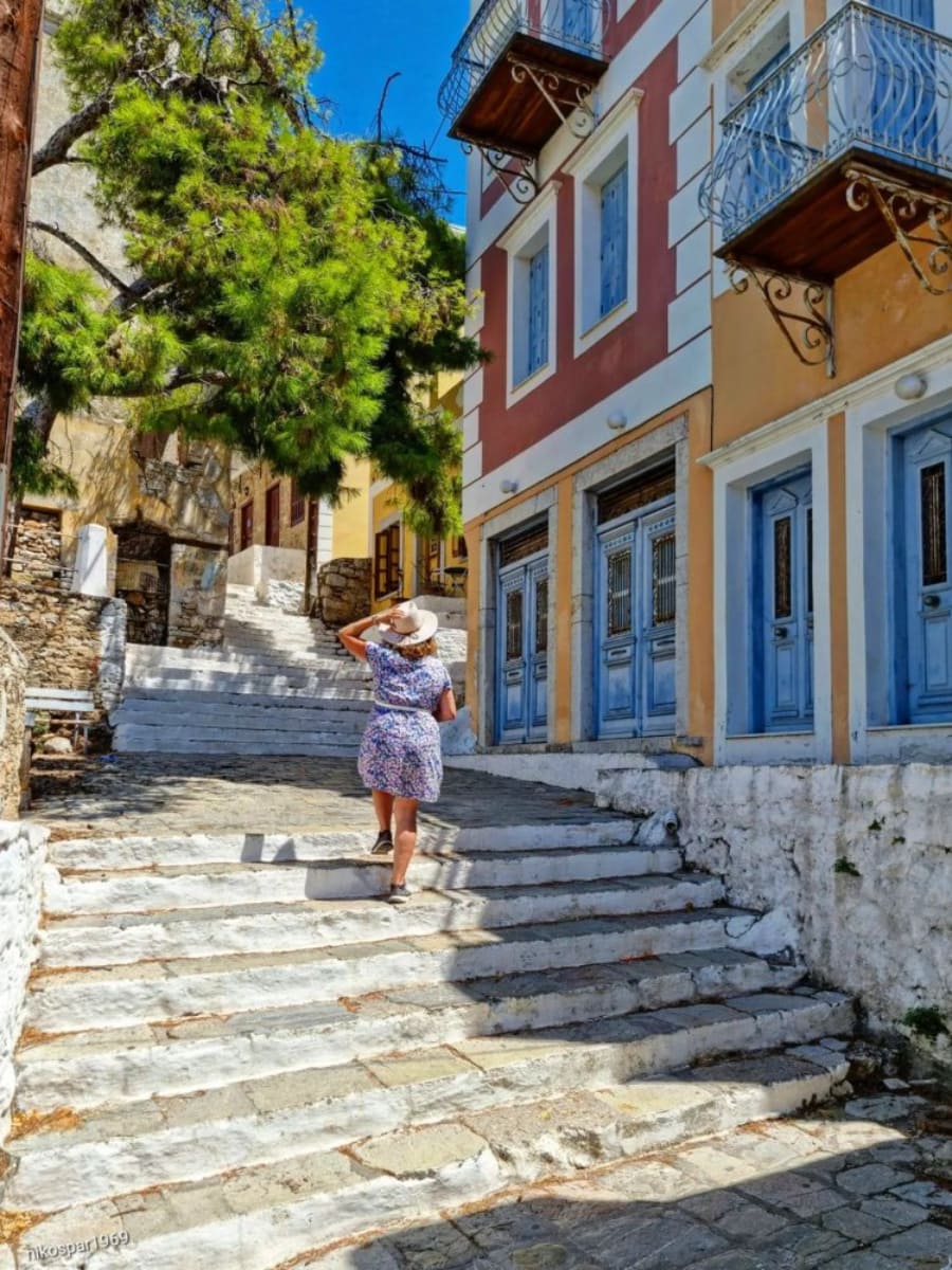 How to Get There. The main path is called Kali Strata, a staircase lined with flowers and neoclassical houses. The walk takes about 20–30 minutes from Gialos. Wear sturdy shoes and bring water-there are no shops at the top.