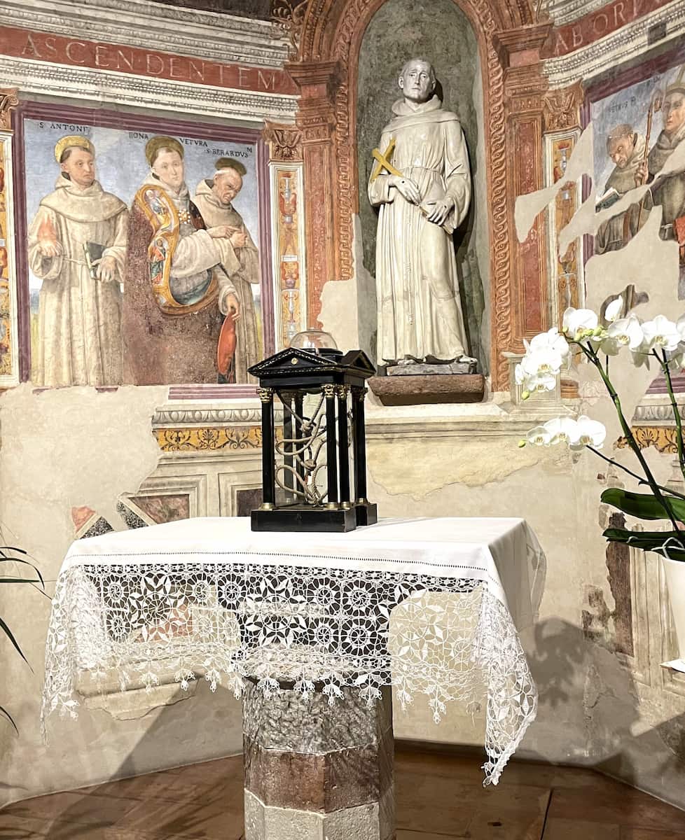 Hermitage. The Eremo delle Carceri, Saint Francis’s mountain retreat, is surrounded by ancient oak trees that turn deep red in autumn. I followed the peaceful path where Francis reportedly preached to birds, now lined with spectacular fall foliage.